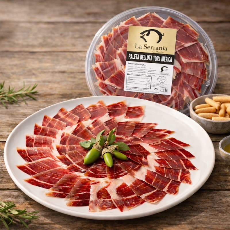 - Paleta de Bellota 100% Ibérica: intensidad pura. Loncheada a mano por nuestros maestros para respetar la fibra del corte.