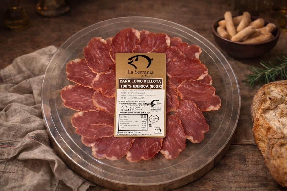 - Caña de Lomo de Bellota 100% Ibérica (80g): el lomo en su máxima expresión, curado de forma tradicional con especias naturales.