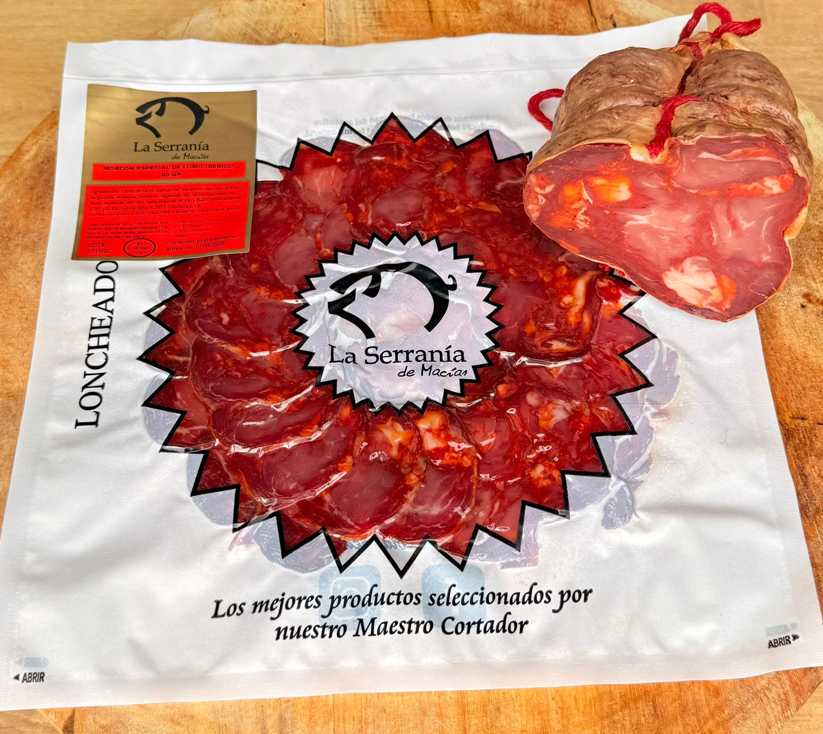 Disfruta de nuestro Morcón Especial de Lomo Ibérico loncheado a máquina y envasado al vacío en sobres de 80 gramos. Disfruta del morcón de lomo ya loncheado listo para abrir y comer.